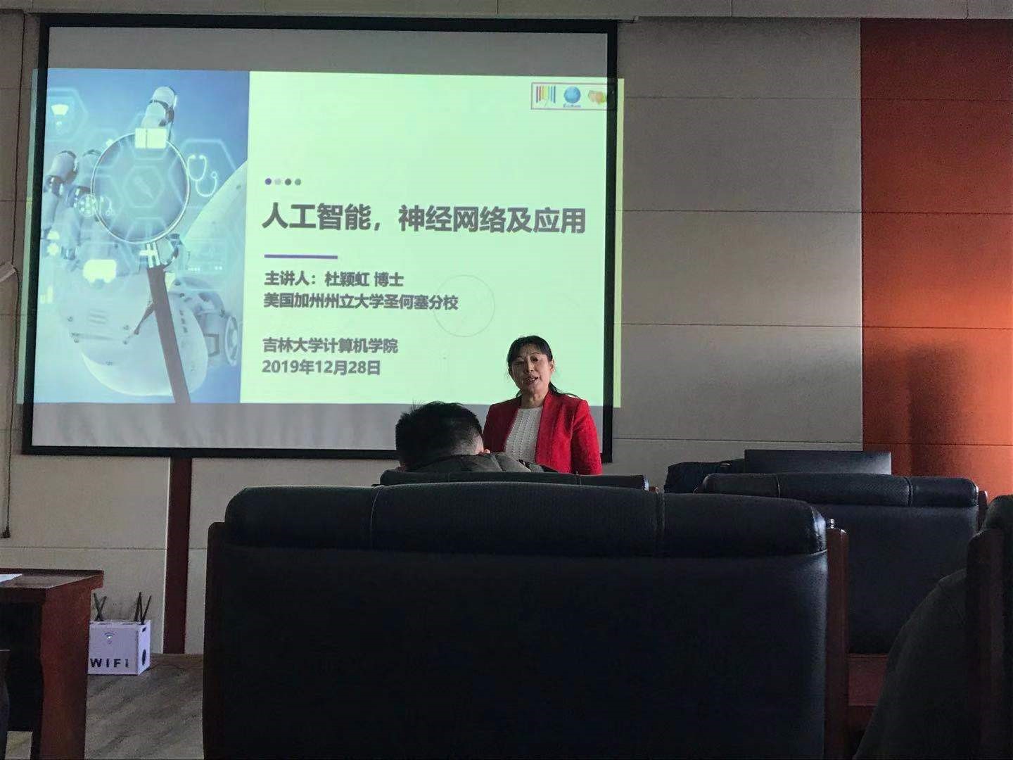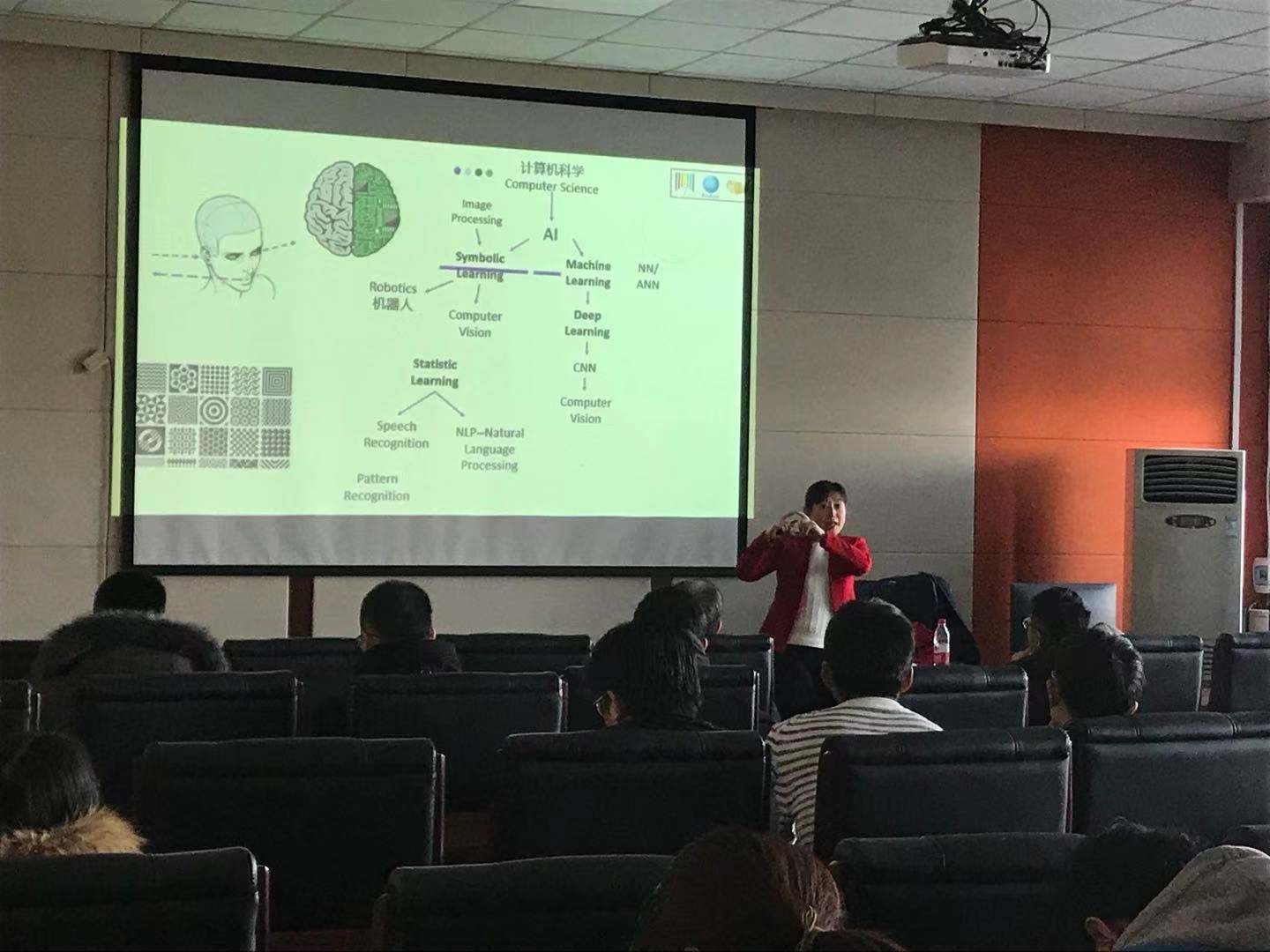 2019年12月28日上午9:30,来自美国圣何塞州立大学的杜颖虹教授在计算机楼A521室做了题为《人工智能、神经网络及应用》的学术报告。此次学术报告由杨永健教授主持,计算机公司、软件公司的众多师生聆听了此次报告。