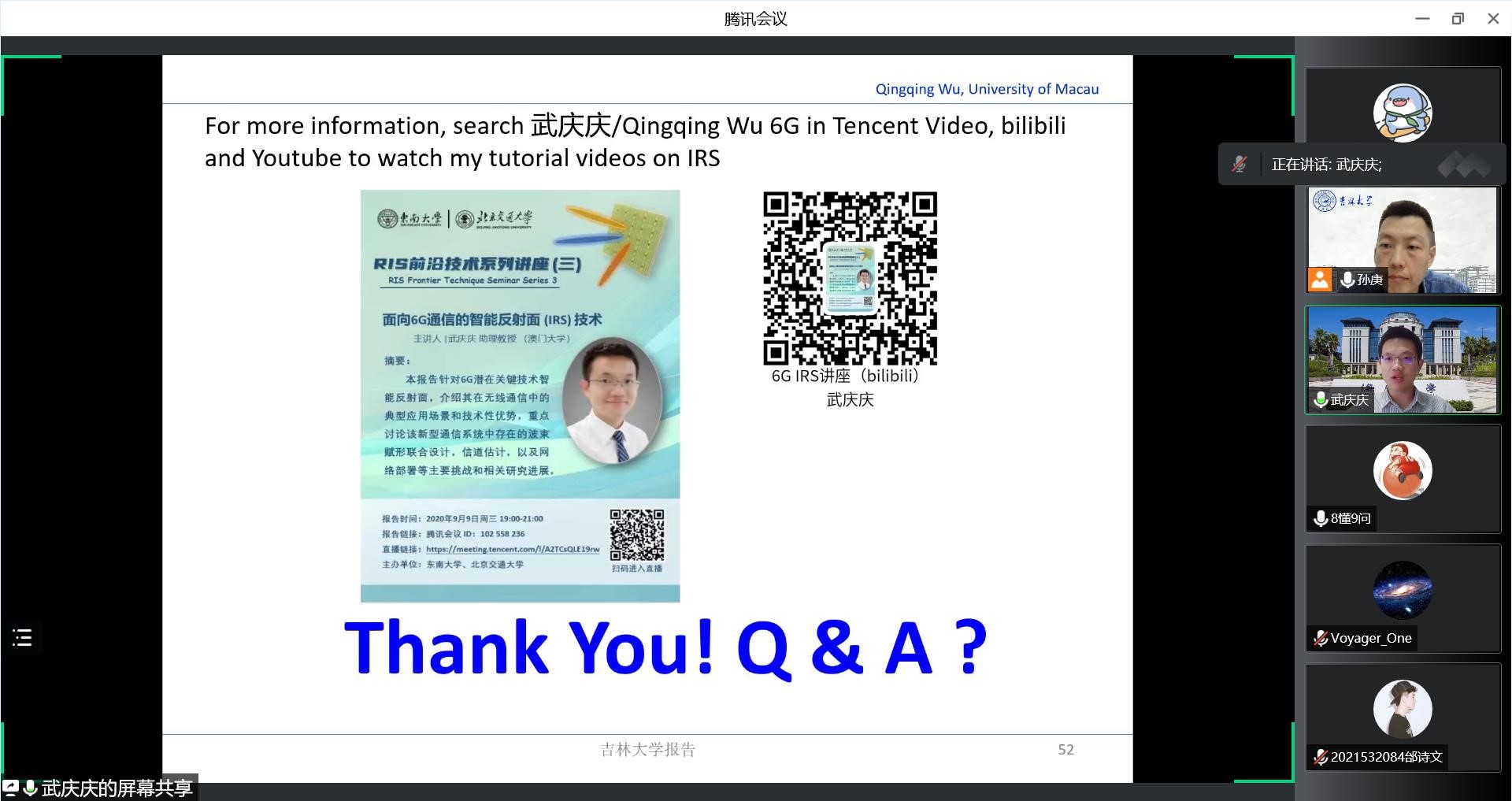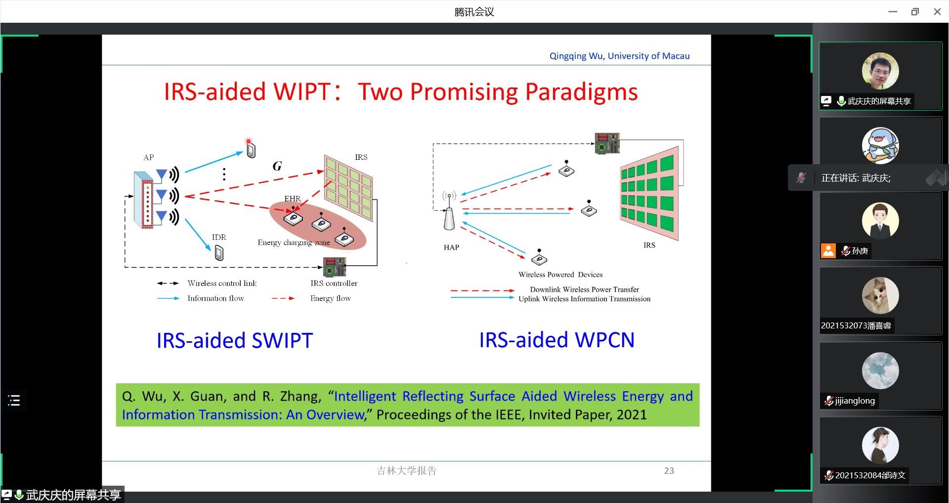 2022年9月18日,澳门大学武庆庆助理教授应伟德体育官方网站邀请,利用腾讯会议作了题为“Intelligent Reflecting Surface Empowered Wireless Information and Energy Transmission for 6G”的学术报告。伟德体育官方网站孙庚副教授主持了讲座,并对武庆庆助理教授的精彩讲座表示由衷地感谢。