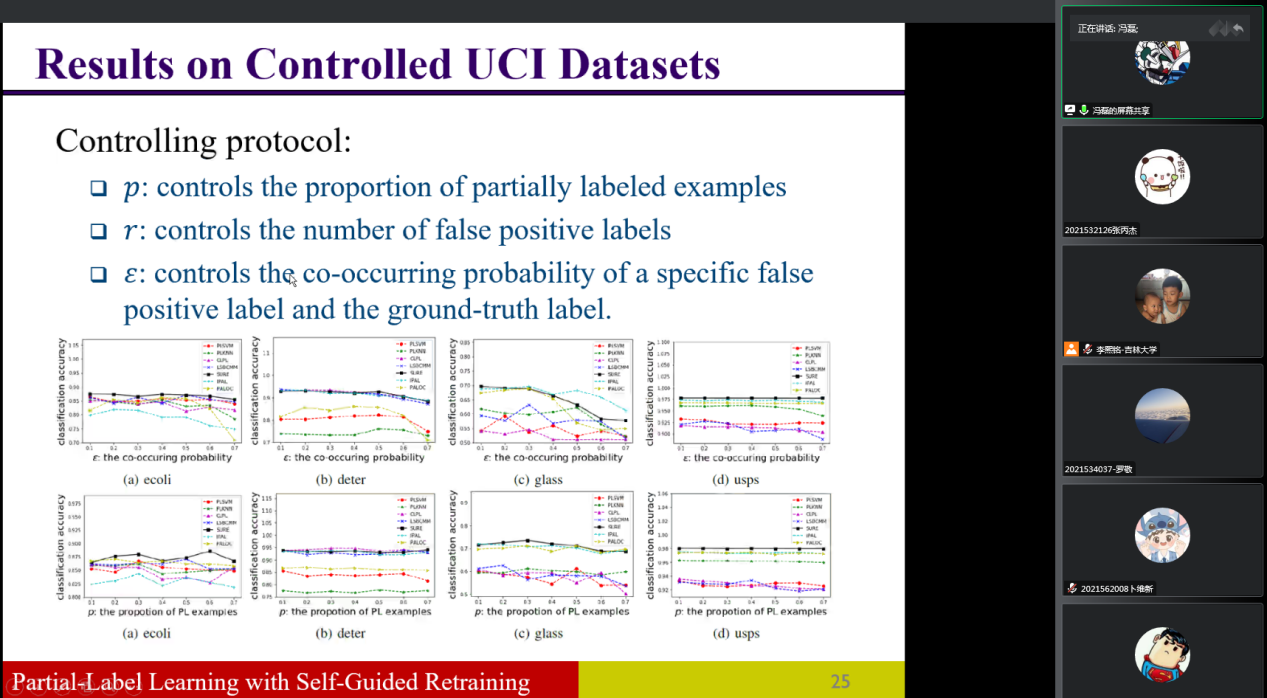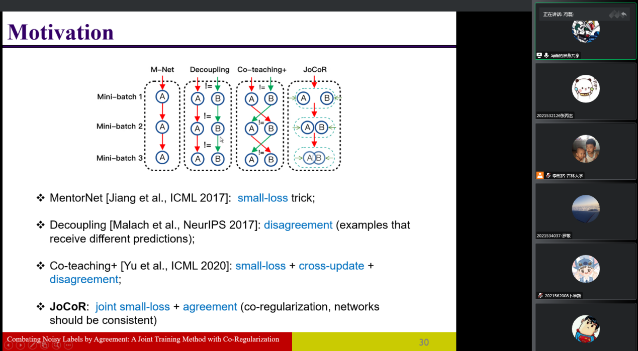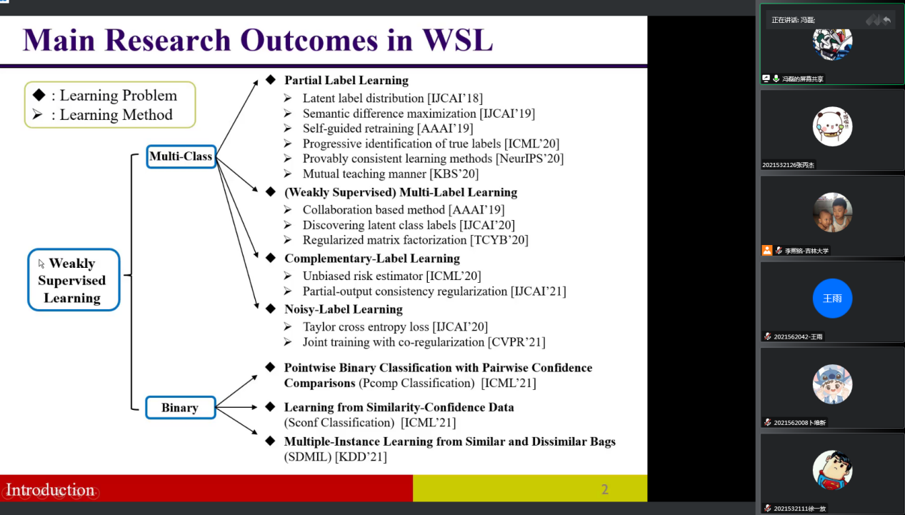 讲座开始后,冯磊教授首先介绍了监督学习和无监督学习的目标,然后介绍了弱监督学习的定义和弱监督学习领域的一些前沿问题(例如:偏标记学习、噪声标记学习和新型弱监督二分类问题),并依次介绍了这些问题的数据生成模型、解决问题的算法、以及相应的理论性质。随后,冯磊老师介绍了自己团队关于弱监督领域的一系列工作。