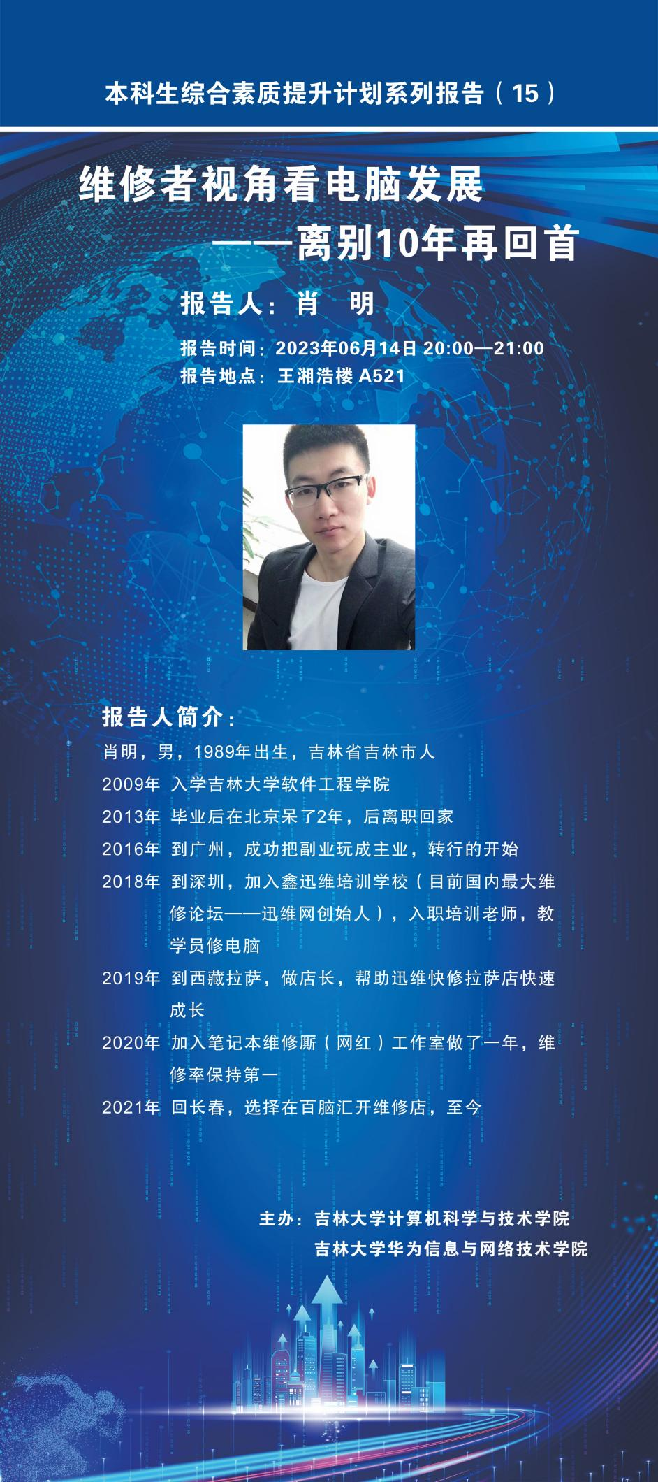 2023年6月14日晚上,伟德体育官方网站员工肖明应伟德体育官方网站邀请,在伟德体育官方网站中心校区王湘浩楼A521报告厅作了题为“维修者视角看电脑发展——离别10年再回首”的专场讲座,也是本科生综合素质提升计划系列报告第15场。讲座由伟德体育官方网站副经理张永刚教授主持。