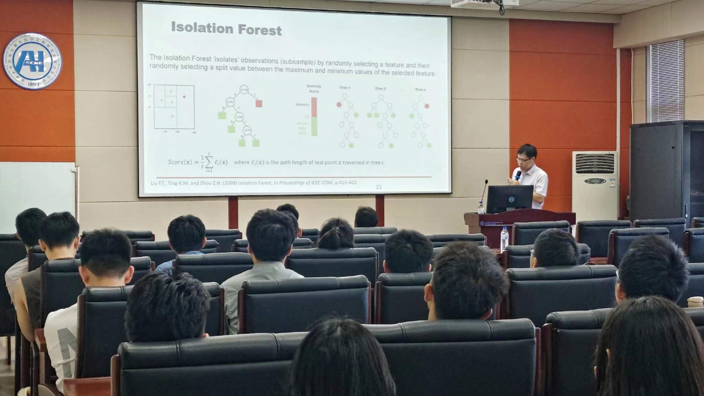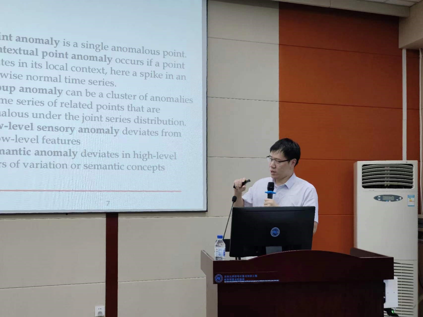 在学术报告讲座中,Ye Zhu博士与同学们分享了异常检测在人工智能领域的常用方法与发展前景。异常检测是数据挖掘的一项重要任务,也是人工智能各个领域的研究热点。它有许多应用,例如检测极端气候事件,机械故障,恐怖分子,欺诈,恶意url等。首先,Ye Zhu博士带领同学们全面回顾基于浅层和深度学习的异常检测方法,并对这些方法进行了深入的解释。其次,Ye Zhu博士将阐述关键的直觉,目标函数,潜在的假设,以及最先进的异常检测技术的利弊,还将介绍几种为深度探测模型提供异常解释的原则方法。最后,Ye Zhu博士就经典的浅层方法和新颖的深层方法之间的联系展开讨论,并就如何在不同情况下选择合适的离群值检测器提供实用指导。