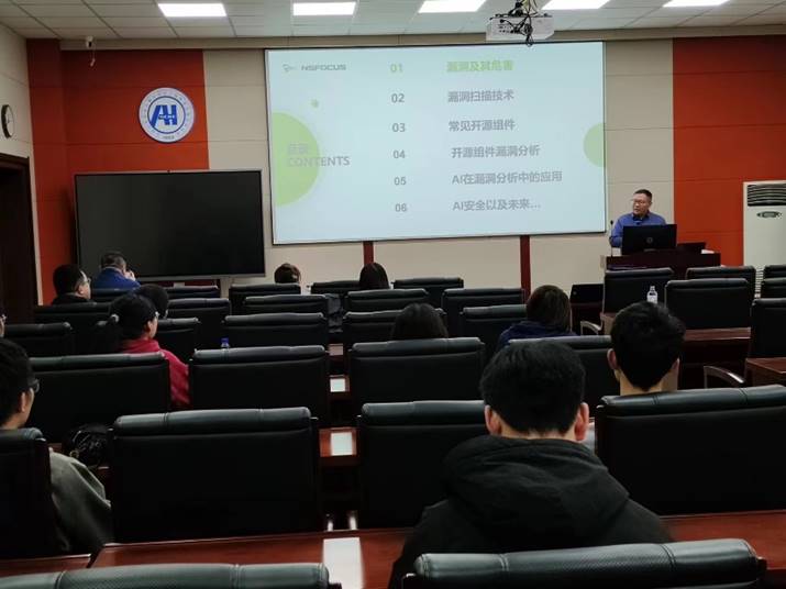 2024年4月13日上午,绿盟科技集团股份有限公司产研线副总经理樊志甲在伟德体育官方网站中心校区王湘浩楼A521会议室为公司师生进行了题为“开源漏洞分析以及AI在漏洞分析中的应用与发展”的技术培训讲座,伟德体育官方网站副经理李强教授主持了此次讲座,公司网络空间安全专业的部分老师和员工参加了本次活动。