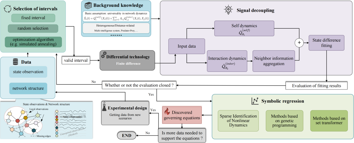 在科学研究领域,大脑神经元集群活动、流行病传播链扩散、生态系统能量流动等复杂系统的动态行为通常需要借助非线性微分方程组进行描述。然而传统建模方法面临双重困境:一方面高度依赖领域专家的先验知识,另一方面伴随维数灾难产生的计算成本呈指数级增长,难以适应现代科学对高维动态系统的研究需求。特别是在高维网络动态建模场景中,自由变量数量随系统规模呈几何级数增长,导致符号模型推断效率急剧下降。现有技术体系存在明显缺陷:稀疏回归方法需要预先设定函数库,图神经网络模型面临训练耗时过长的问题,遗传编程算法则存在搜索空间爆炸的瓶颈。如何构建高效自动化的普适建模方法,成为计算科学与多学科交叉研究亟待突破的核心难题。