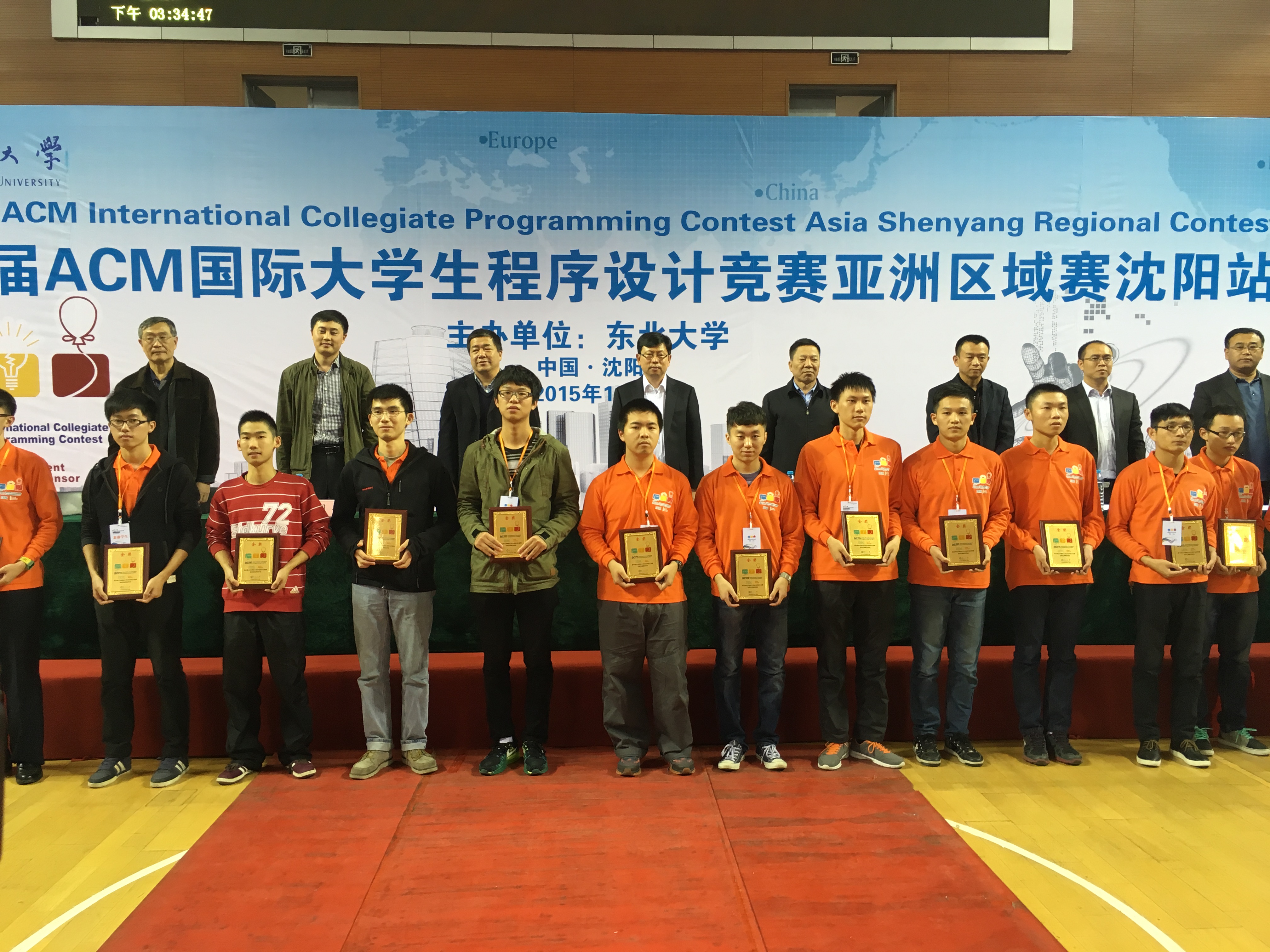 第40届ACM-ICPC国际老员工程序设计竞赛亚洲区沈阳站比赛于2015年10月24日至25日在东北大学刘长春体育馆举行。111所高校的162支参赛队参加了该站的比赛。经过激烈的角逐,共决出金牌17个,银牌34个,铜牌51个。由公司计算机公司2015级本科生邵杰晶、2013级唐敖庆班本科生王心天和软件公司2013级卓越工程师班本科生郭兰哲组成的“三花聚顶”队获得金牌,公司排名第8。