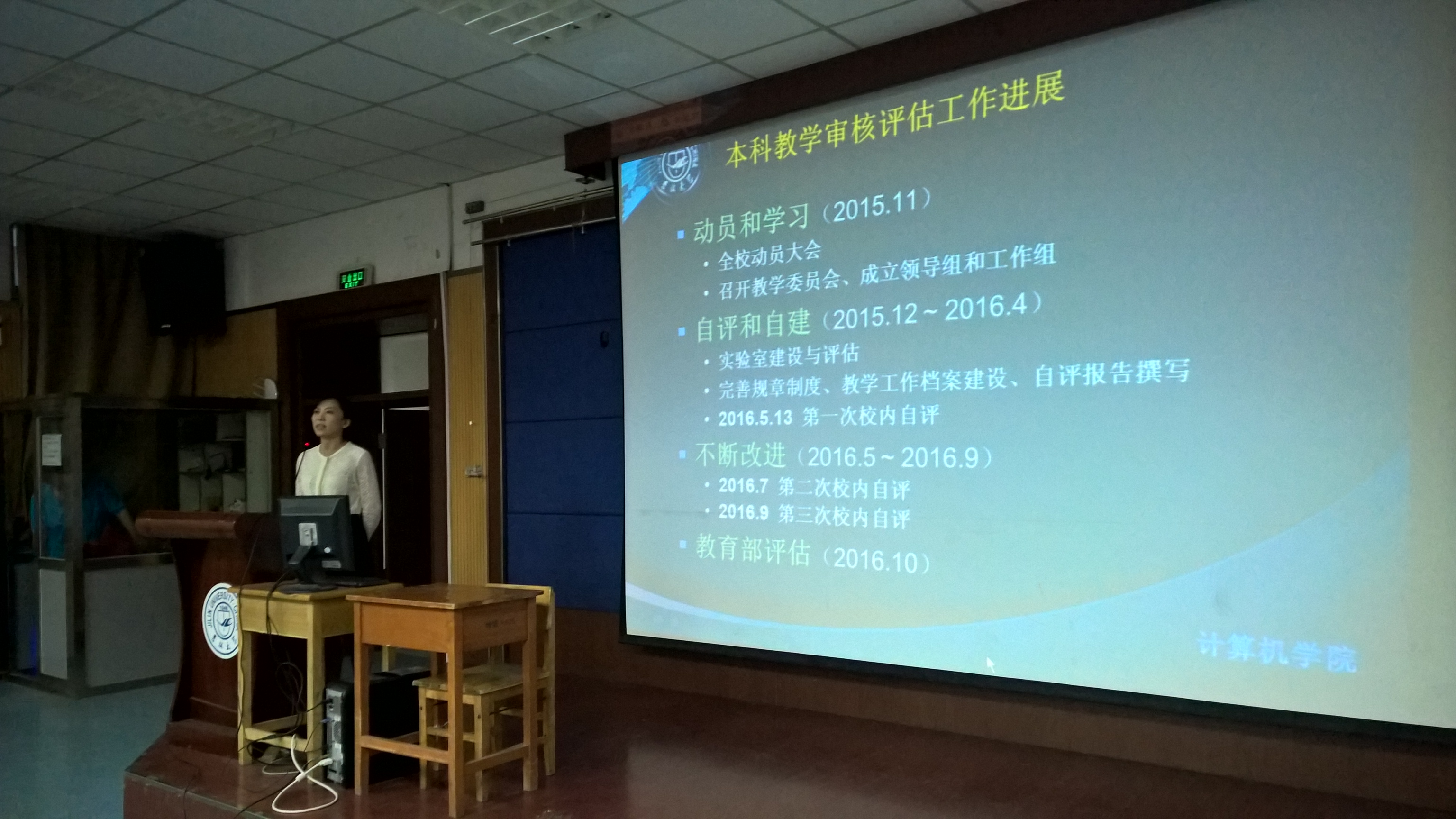 黄岚教授首先介绍了本科教学审核评估工作的进展,评估工作已完成了动员和学习、自评和自建两阶段工作,之后还将进行两轮校内自评并将于10月接受教育部的评估。在之前的校内自评中,计算机公司的各项教学工作获得了公司专家的认可,但仍有部分工作需要改进。黄岚教授根据审核评估指标体系,梳理了计算机公司的各项教学工作,并根据公司专家提出的意见总结了公司教学工作仍存在的问题及改进措施。公司评建工作需要“以评促建、以评促改、以评促管、评建结合、重在建设”,做好这项工作,可以形成常态机制,保障教学工作的顺利开展。