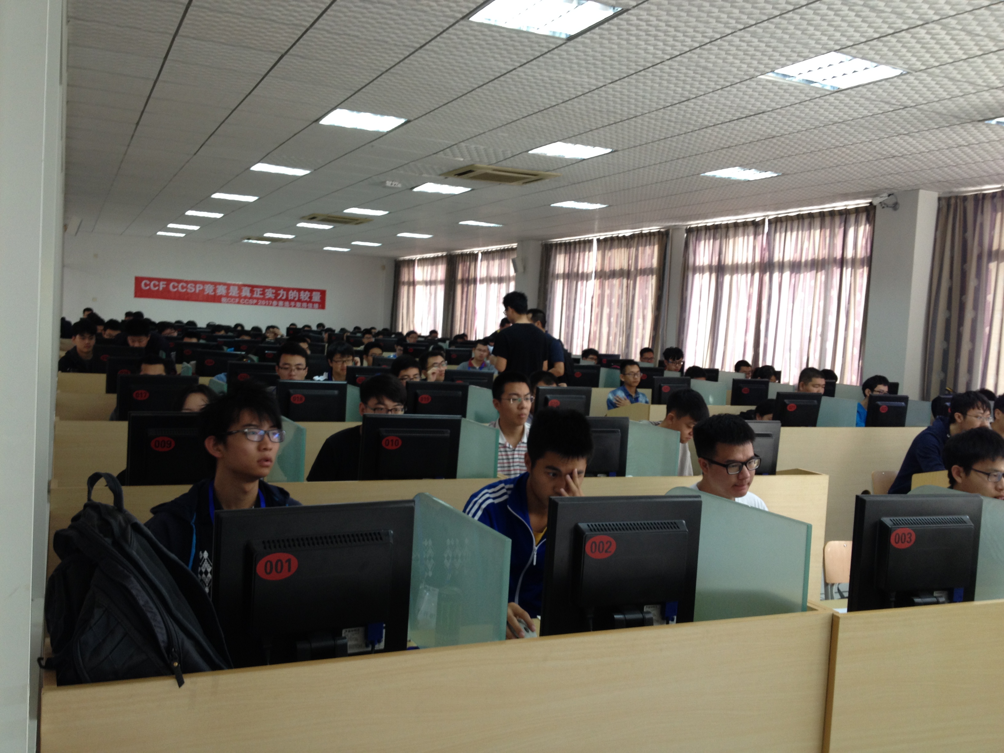 CCSP2017与中国计算机大会(CNCC2017)同时在福州举行。比赛现场在福建师范大学旗山校区笃行楼3楼机房,CNCC会场大屏幕直播比赛实况。10月26日早晨8:00选手入场,8:30比赛开始,晚上22:00比赛结束。提供充足的饮料、水果和食品,午餐和晚餐有简短的用餐间歇。比赛共历时14个小时,对智力、能力和体力都是极大的挑战。比赛结束后,员工们都很疲倦,但还略带兴奋的交流解题情况。