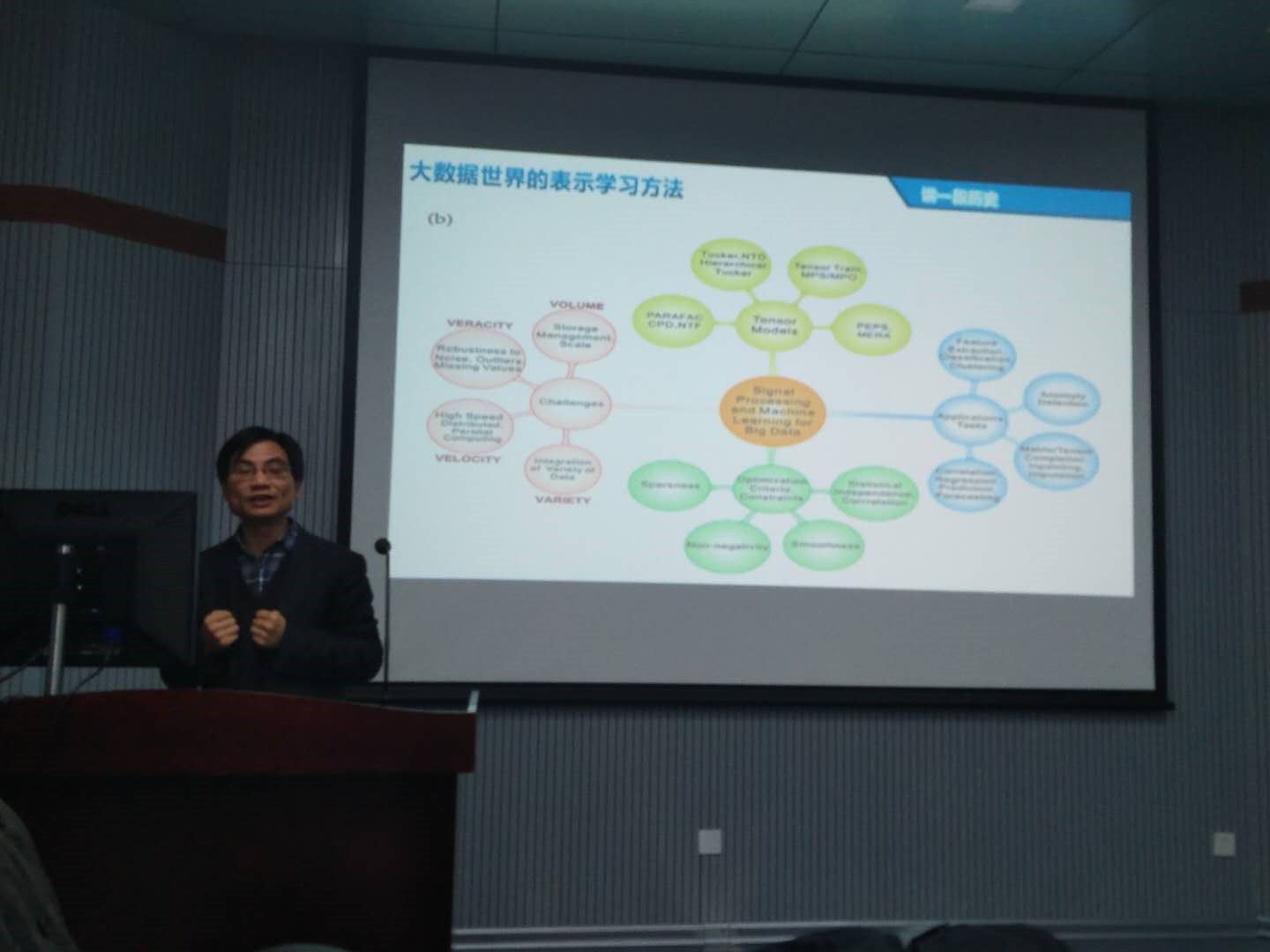 在本次报告中,肖亮教授强调了数据表示学习基本原则是简洁性和高效性。他在报告中介绍了高维信号表示理论的前世今生,并结合病理图像分析、高光谱图像处理与智能分析等研究情况,探索和揭示数据表示和深度学习遇到的一些问题。他进一步通过给出稀疏可分离卷积回归链模型、分层稀疏Boosting决策树集成来解决这一问题,并报告了实验效果。本次报告提出了替代传统深度学习的另外一个可行之路,为广大师生带来了一场思想风暴和学术饕餮,大家在视觉和思想上受到极大震撼。