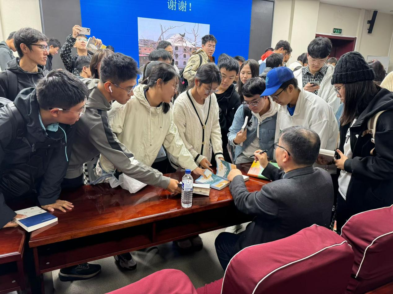 讲座结束后,蔡天新教授热情回答了同学关于旅行如何对数学和文学产生启发的提问。他深刻地阐述了旅行如何拓宽视野、激发灵感,以及如何通过旅行来丰富自己的人生体验。最后,蔡教授向同学们赠送了自己的签名书籍,鼓励大家勇敢探索未知的世界,追求自己的梦想。