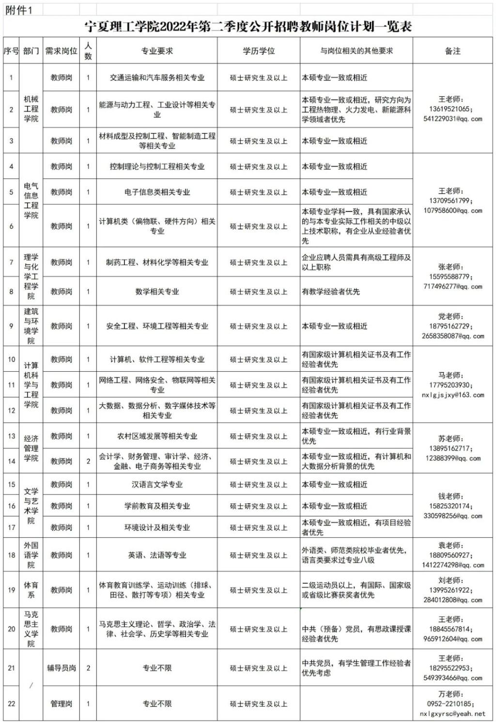 具体详见《宁夏理工公司2022年第二季度公开招聘教师岗位计划一览表》(见附件1)。
